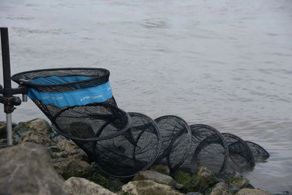 The Supa River holding net is very robustly constructed in every area, making it very suitable for use on canals and rivers with shipping. First of all, it is equipped with a CNC-milled metal block that is threaded in both horizontal and vertical directions. The coarse, rectangular mesh (6×9mm) is highly abrasion-resistant and, thanks to its relatively large openings, easily allows flowing water to pass through, making it less likely to be pulled from its place. The top aluminum ring is equipped with an enlarged diameter, while the other rings are individually equipped with a protective, wear-resistant layer. The bottom features 2 attachment points for adding weight if desired.