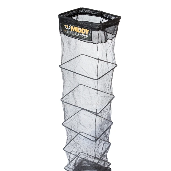 This fast drying Middy keep net offers optimal protection to the caught fish. The net sinks well and has an adjustable corner lock with a rod support- divot top ring and D-rings. The strong, square rings ensure that the net lies tight and spread over the bottom. This keep net is stitched seven times to prevent rotting and will last a long time.