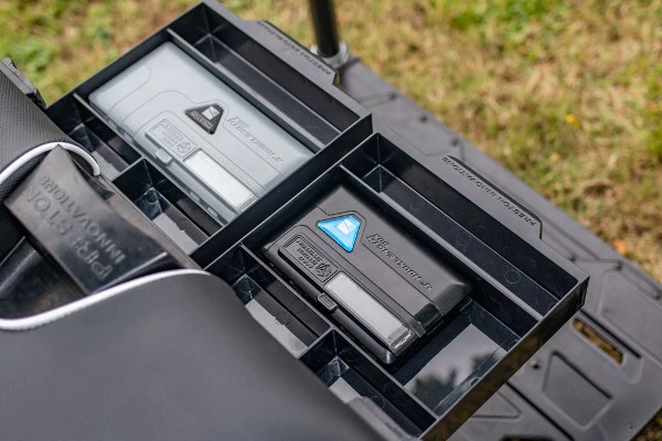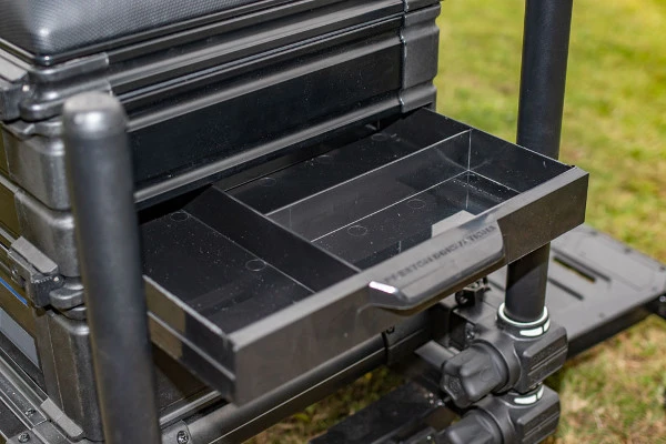 This seatbox contains a 150mm base unit, which is perfect for storing larger items such as baitcasting reels. The unique one-piece block has two deep front drawers, a deep side drawer and a shallow drawer unit. Each drawer is already fitted with an organizer, so you can store all your small equipment in a tidy manner. The unique Mag-Lok® clips, keep the units securely together during transport, but also allow them to be opened instantly. The footplate is now held in place by locking pins, two on each side, allowing the unit to be moved quickly into position and the footplate to remain perfectly in place at all times.