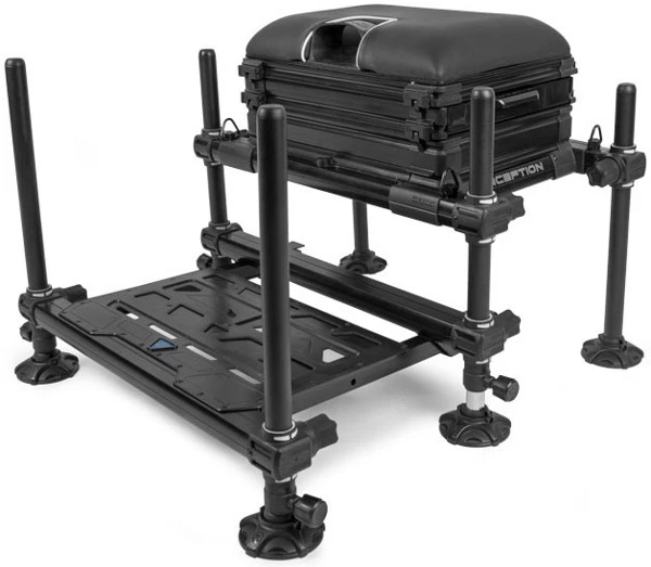 The Inception 360 comes complete with 100mm deep base unit and a side compartment drawer. The hand wheels have a soft touch coating, making them easier to handle in cold and wet weather conditions. Supplied with four telescopic legs, making the seat box more suitable for uneven terrain and wading fishing. The footplate is held in place by two pull-out pins, making it quicker to set up and keeping the footplate perfectly in place every time. Equipped with Mag-Lok® clips, these ensure that the units are held securely together, but can also be opened in a second.