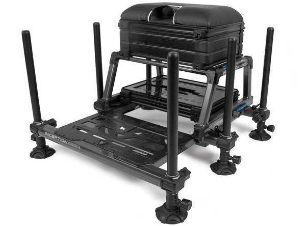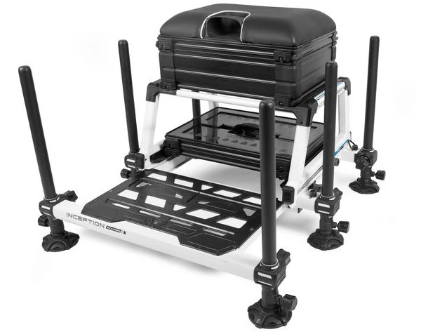 Building on the success of the other Inception Seatboxes, the new Inception Station Seatbox is equipped with many of the same features, such as Mag-Lok clips, a footplate that easily locks in place and soft touch adjustment wheels. Built on the super strong and attractive looking frame, the Inception Station Seatbox offers a large amount of storage capacity. The deep, compartmentalized side drawer unit is perfect for accessories, while the deep side drawer with removable dividers can be used for leaders boxes, rigging boards or other, larger accessories. An empty, shallow drawer can be found between the drawers and the seat, where you can also store leaders for fixed-line fishing in an excellent way. The cassette under the frame comes with a 26mm drawer and lid, additional drawers can be added if required. The seat box is supplied with six telescopic legs, so accurate adjustment on the bank is not a problem.