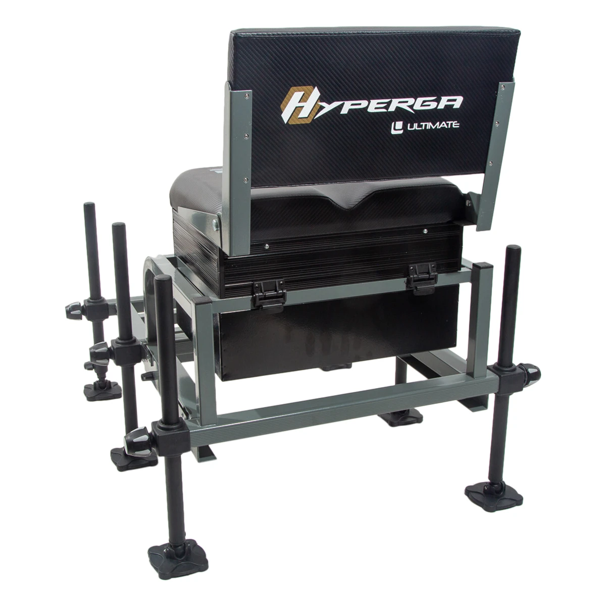 Comfortable, robust and reliable are the keywords for this Hyperga Seatbox from Ultimate. A luxury fishing box that exudes a lot of class. Constructed on a sturdy and durable base and equipped with plenty of storage space. The seatbox has six legs with a length of 45cm, two of which are freely adjustable. The legs are also finished with fully tiltable mud feet, so you always sit stable and straight. A robust footplate and deluxe seat contribute to high comfort. Furthermore, the Hyperga Seatbox includes a deep storage module and two front drawers with ergonomic handle, so you always have your fishing equipment within easy reach. The large, ergonomic steering knobs and extendable footplate complete this seatbox. For easy access to the storage module, the seating area is completely removable.
